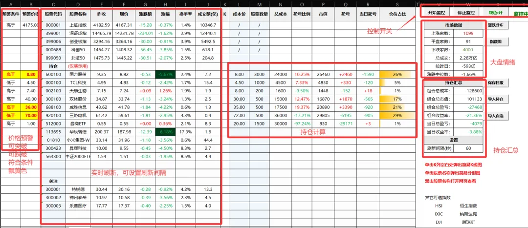但是我这里正好有一个上班摸鱼看盘的好东西,可以分享给你。预警区。实时行情区。持仓统计。大盘情绪。控制开关等。你要想看大图,那么双击股票名称,会直接给你打开东财的行情页面。