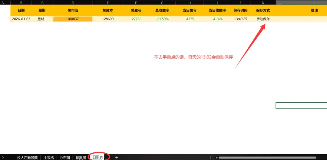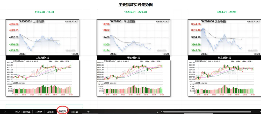 涨跌分布,指数图,保存日报都是可以点击的按钮。