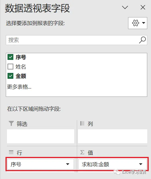 3. 在右侧的“数据透视表字段”区域,将“序号”拖动到行区域,“金额”拖动到值区域。