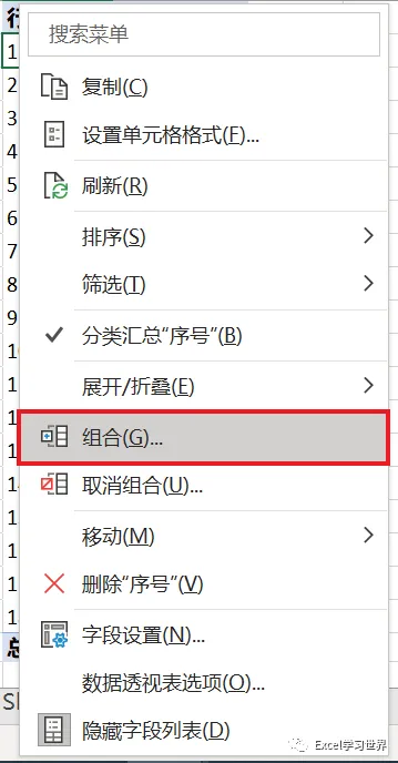 4. 选中数据透视表行区域的任意单元格 --> 右键单击 --> 在弹出的菜单中选择“组合”
