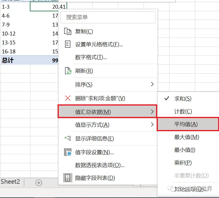 6. 选中值区域的任意单元格 --> 右键单击 --> 在弹出的菜单中选择“值汇总依据”-->“平均值”