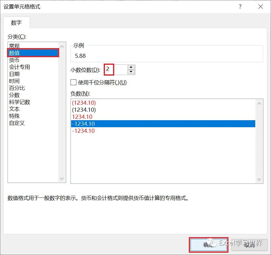7. 在弹出的对话框中选择“数值”--> 将小数位数设置为 2 --> 点击“确定”