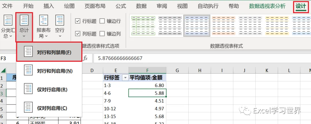 8. 选中数据透视表的任意单元格 --> 选择菜单栏的“设计”-->“总计”-->“对行和列禁用”