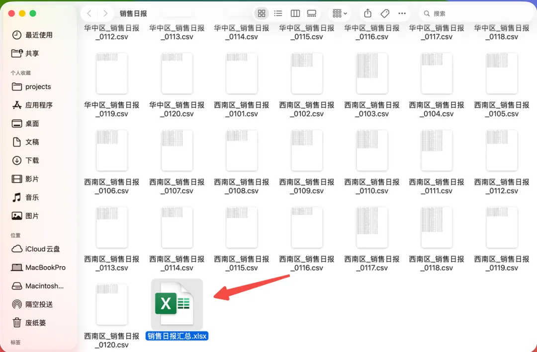 我桌面上有一个销售日报的文件夹,里面有过去 20 天的销售日报。请帮我合并一下,汇总成一个 Excel 文件。汇总完成后,保存在这个文件夹里面,并且自动打开这个 Excel