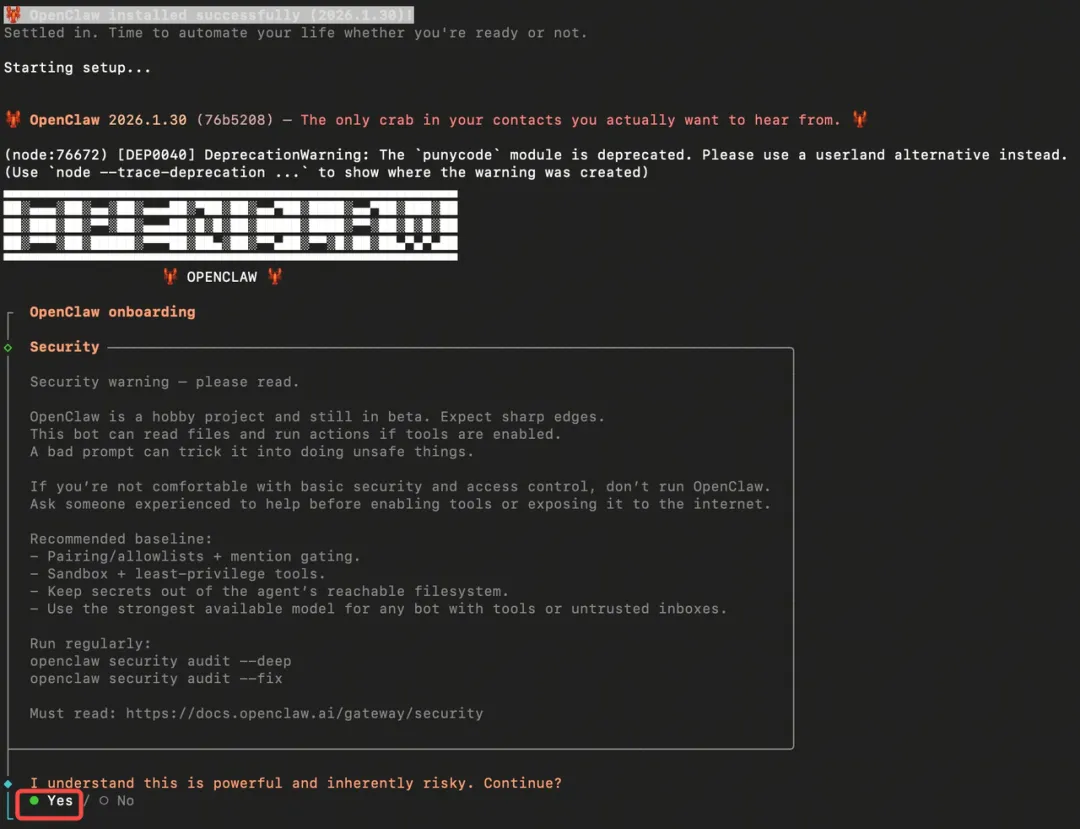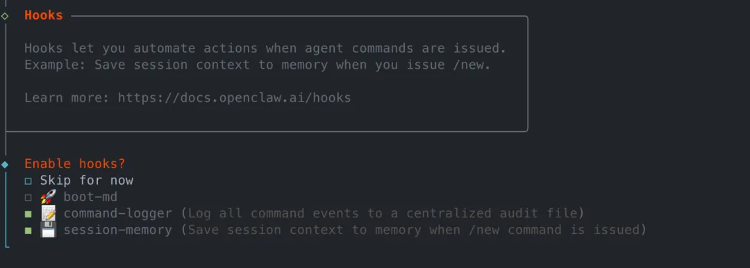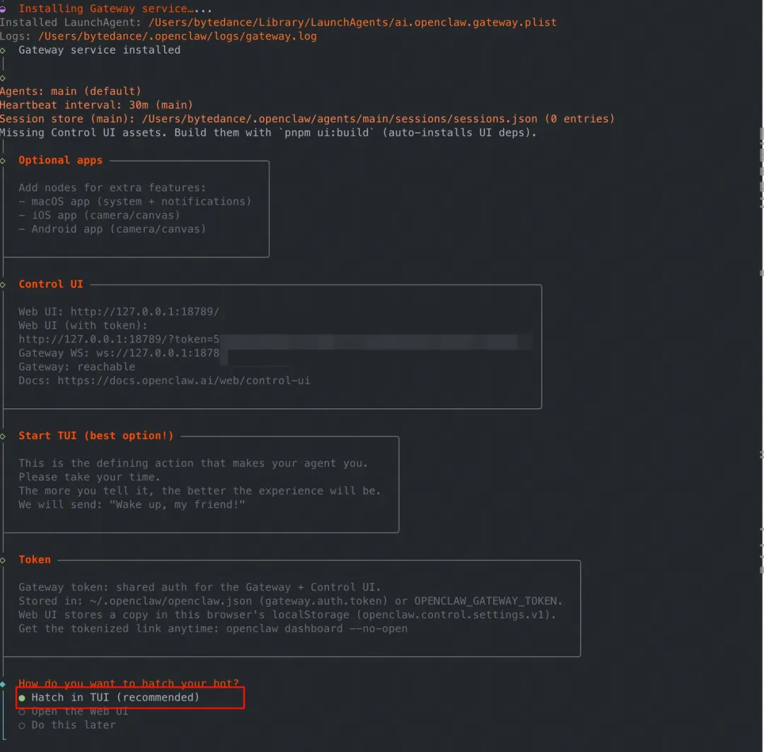 步骤8、Hook 配置完成后,会自动进行网关的配置,然后选择 TUI 默认选项结束安装