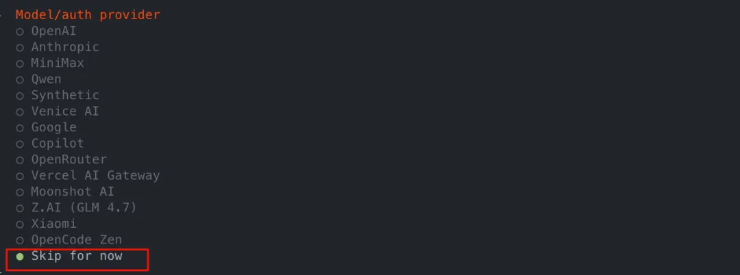 步骤3、模型可以选择“Skip for now”,后续再配置方舟 Coding Plan