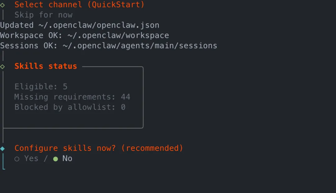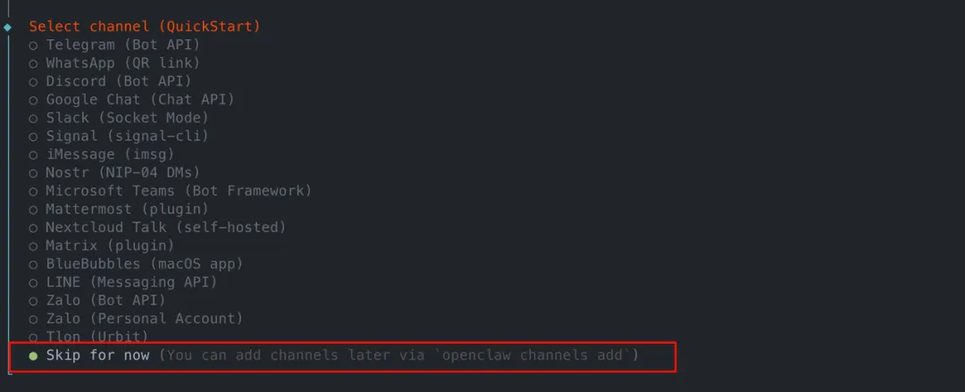 步骤5、channel 选择“Skip for now”,后续自定义飞书作为 channel