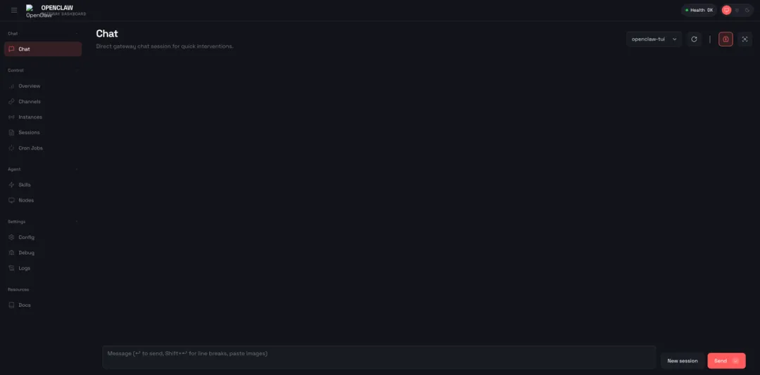 步骤9、上面终端流程走完后,我们在浏览器中访问下面的地址,如果正常出现管理后台则代表安装过程已经成功:http://127.0.0.1:18789/