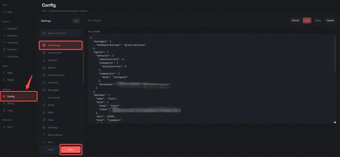 在 OpenClaw 的 Web UI 中,选择 Settings -> Config -> Authentication,在底部选择 Raw 方式查看配置信息。