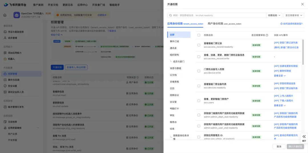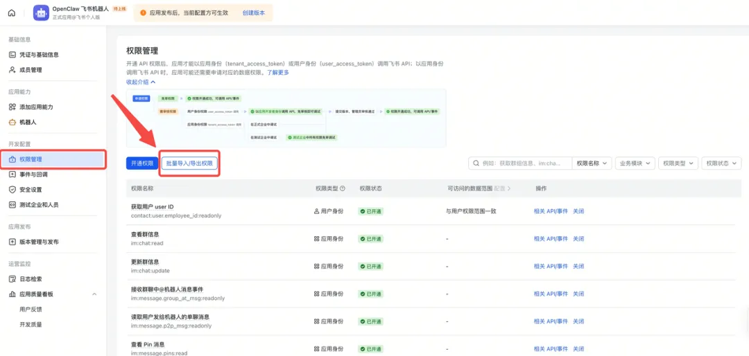d. 后续可在“开通权限”中为机器人开通更多权限
