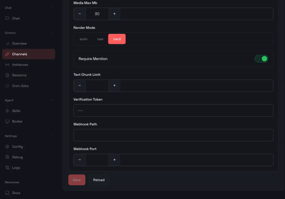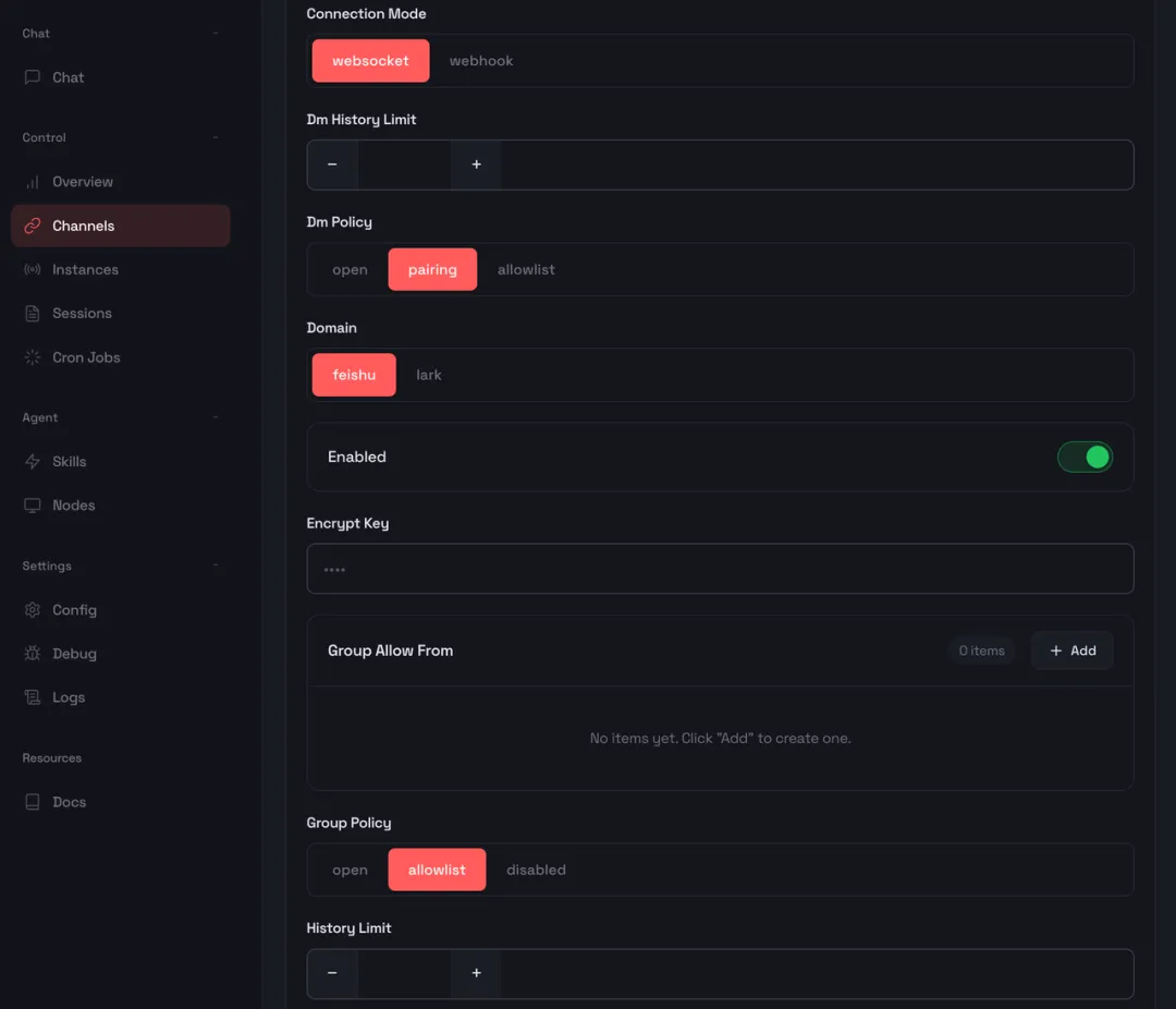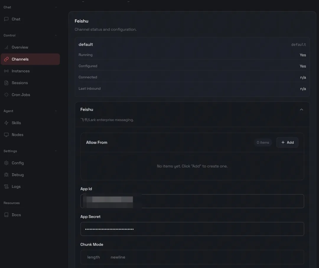步骤4、在 OpenClaw Web UI 中配置飞书 Channels