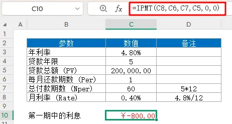 该函数的含义是:基于固定利率是4.8%,你未来60个月,第一个月需要还的总金额里有800元是支付利息的。负号指的是钱从口袋的流出。- 时间单位需要保持一致。如果是按照月,年利率÷12,年限×12。