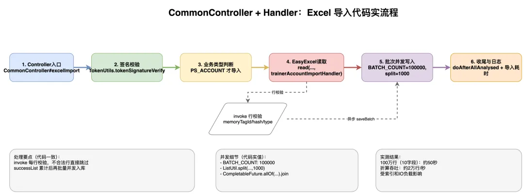 @Overridepublic void excelImport(String authorization, ExcelImportDTO excelImportDTO) { // 验证签名 TokenUtils.tokenSignatureVerify(authorization); ExcelImportBusinessType businessType = ExcelImportBusinessType.getByCode(excelImportDTO.getBusinessType()); try { long beginTime = System.currentTimeMillis(); // 账号导入 if (ExcelImportBusinessType.PS_ACCOUNT.getCode().equals(excelImportDTO.getBusinessType())) { // easyexcel的read方法进行数据读取 EasyExcelFactory.read(excelImportDTO.getFile().getInputStream(), PsTrainerAccountDTO.class, trainerAccountImportHandler) .sheet() .doRead(); } else { throw new ServerException("businessType is error..."); } double time = (System.currentTimeMillis() - beginTime) / 1000.00; log.info("导入{}文件耗时:{}秒", businessType.getDesc(), time); } catch (IOException e) { log.error("导入{}文件异常", businessType.getDesc(), e); }}PsTrainerAccountImportHandler 关键处理片段PsTrainerAccountImportHandler 的核心策略是:累计到 BATCH_COUNT 后切分为 1000 一组,并发执行 saveBatch。