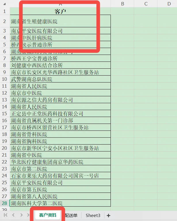 1.新建一个sheet页,改名为“客户资料”,将所有合作的客户复制到A列。