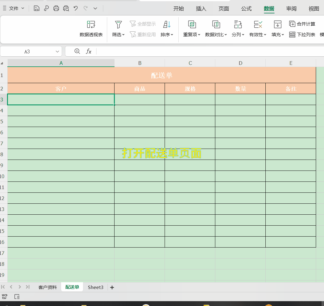 2.在配送单sheet页,选择客户名称列(不包含标题行),然后点击数据-有效性,弹出设置弹框,在允许选项的下拉框处选择序列,然后在来源处选择客户资料页的所有客户名称,点击确定便大功告成。