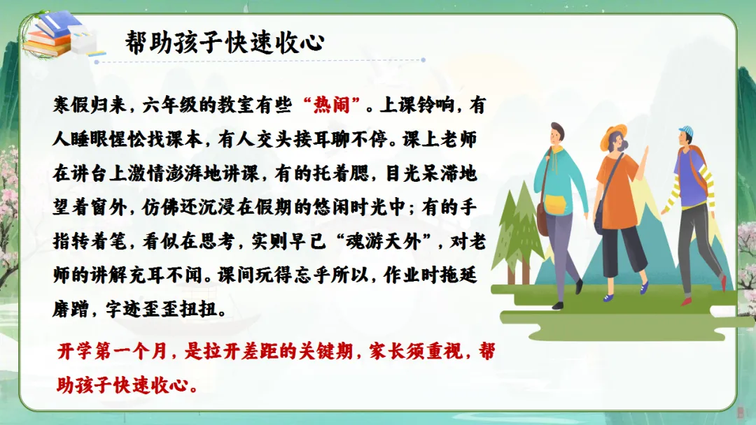 寒假刚过,孩子们回到课堂,状态难免有些“放飞”。有的上课走神,有的作业马虎,有的还沉浸在假期的节奏里。开学第一个月,是帮助孩子调整状态、拉开差距的关键期。在此,我分享几点收心建议: