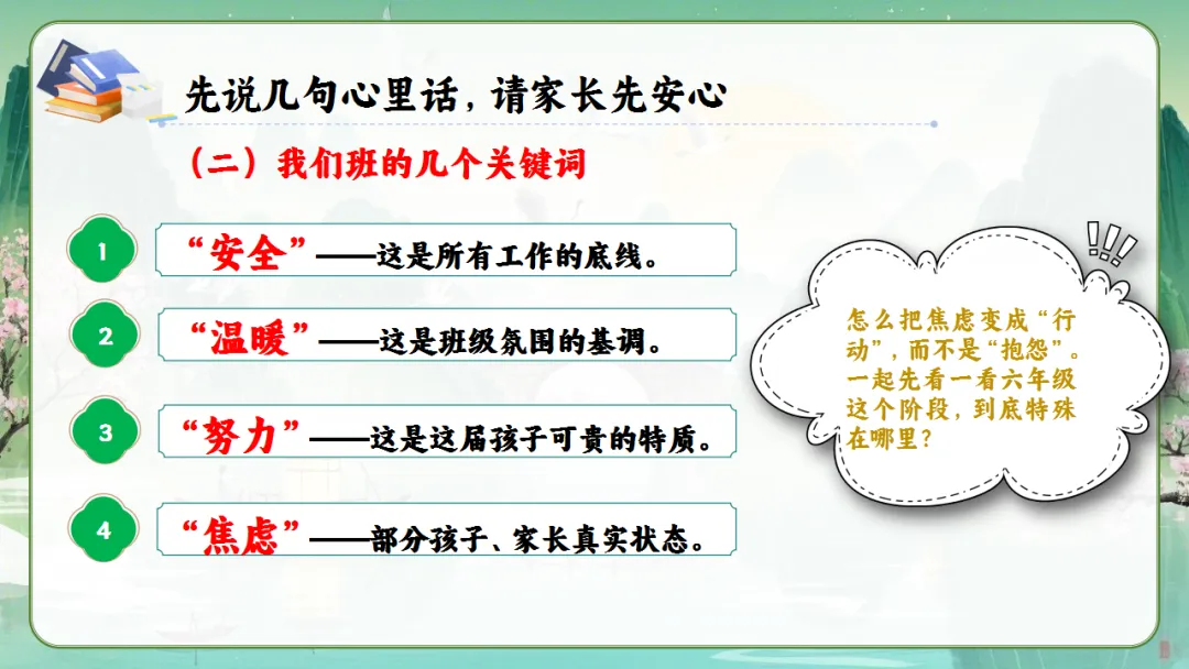 大家好!欢迎来到六年级下学期开学家长会。我是班主任×××。今天,我们相聚在这里,不仅是为了迎接新学期,更是为了共同陪伴孩子们跑好小学阶段的“最后一棒”。这是一段旅程的终点,更是新征程的起点。让我们携手,助力孩子自信、从容地迈向中学,成长为更好的自己。