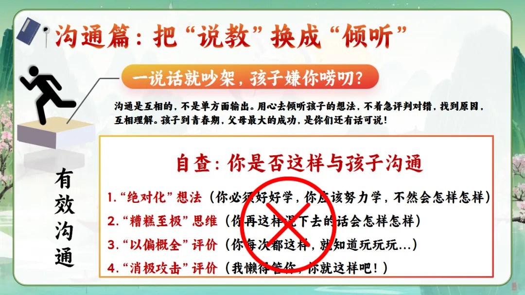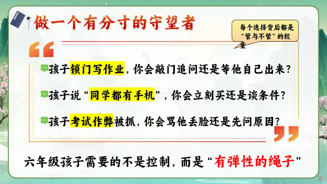 心理在成熟:自我意识增强,但还不稳定。我们要学会“换一种方式爱孩子”——少命令,多商量;少否定,多引导。