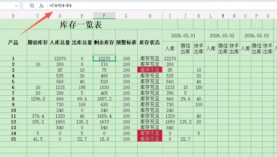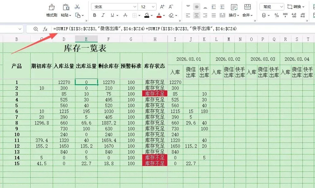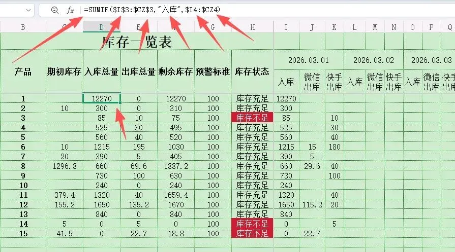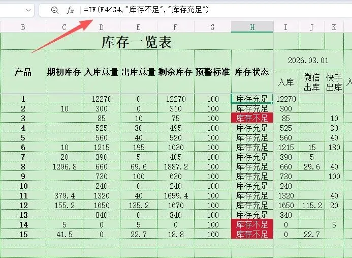 * 作用:自动判断库存是“充足”还是“不足”,这是表格智能化的关键。