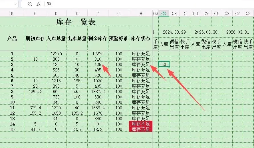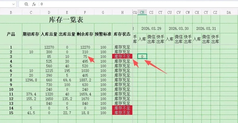 → 这是你要“检查条件”的范围。在图中,这一行是“2026.03.29 入库”、“微信出库”、“快手出库”……一直到“2026.03.31 快手出库”。