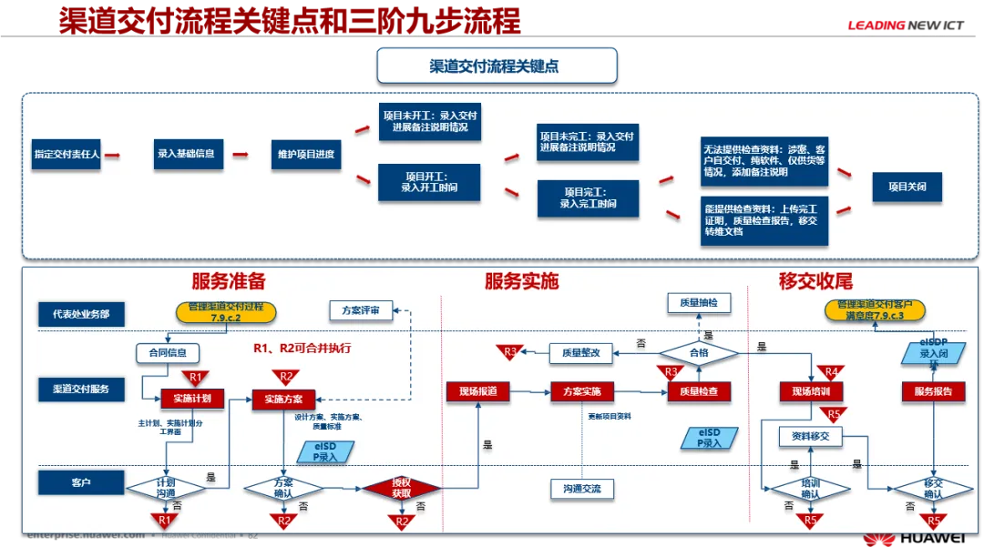 在清晰的角色分工基础上,华为针对渠道类项目交付的特点,识别并定义了贯穿交付全生命周期的渠道交付流程关键点。这些关键点如同流程中的“控制阀”,是项目质量、进度、成本、客户满意度的核心保障区域,必须进行重点管理与监控: