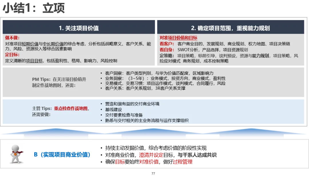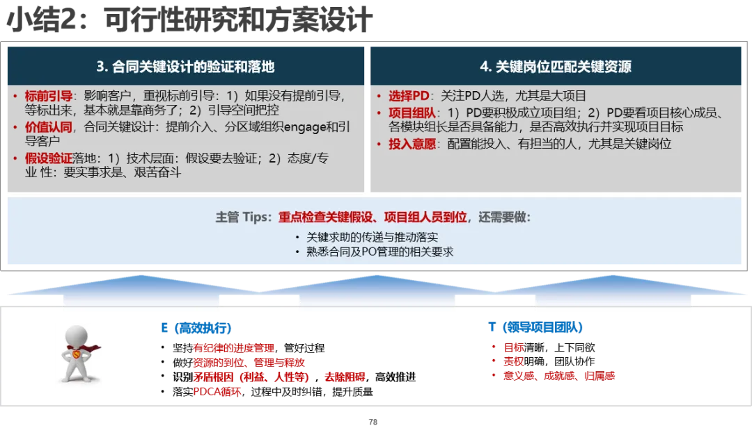 验收与闭环: 项目最终的客户验收是价值实现的临门一脚。关键点在于依据合同和前期确认的验收标准,准备完整、规范的验收文档,进行充分的测试验证,确保所有问题解决,获得客户正式的验收签字。同时,项目经验教训的总结、知识资产的归档、合同尾款的回收等闭环工作也在此关键点完成,由B(华为项目组)主导,S(客户)确认,T(销售)可能协助商务闭环。