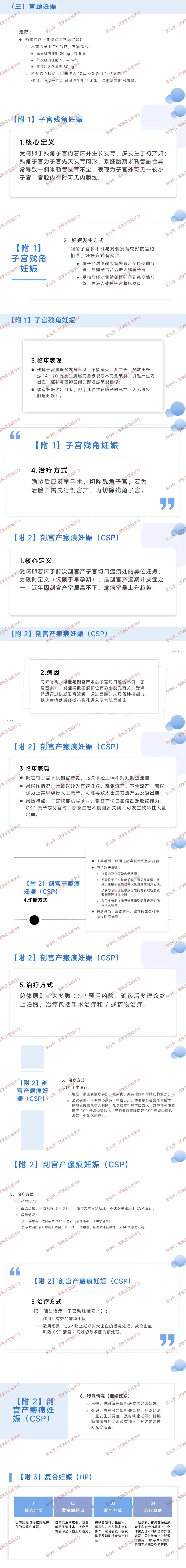 - 治疗:手术治疗选宫颈管搔刮术或吸刮术,术前需预处理降低出血风险,做好输血准备,出血不止时采取相应止血措施;血流动力学稳定者术前用 MTX 治疗,有多种用药方案,可先注 10% KCl 到孕囊内(有胎心搏动时)