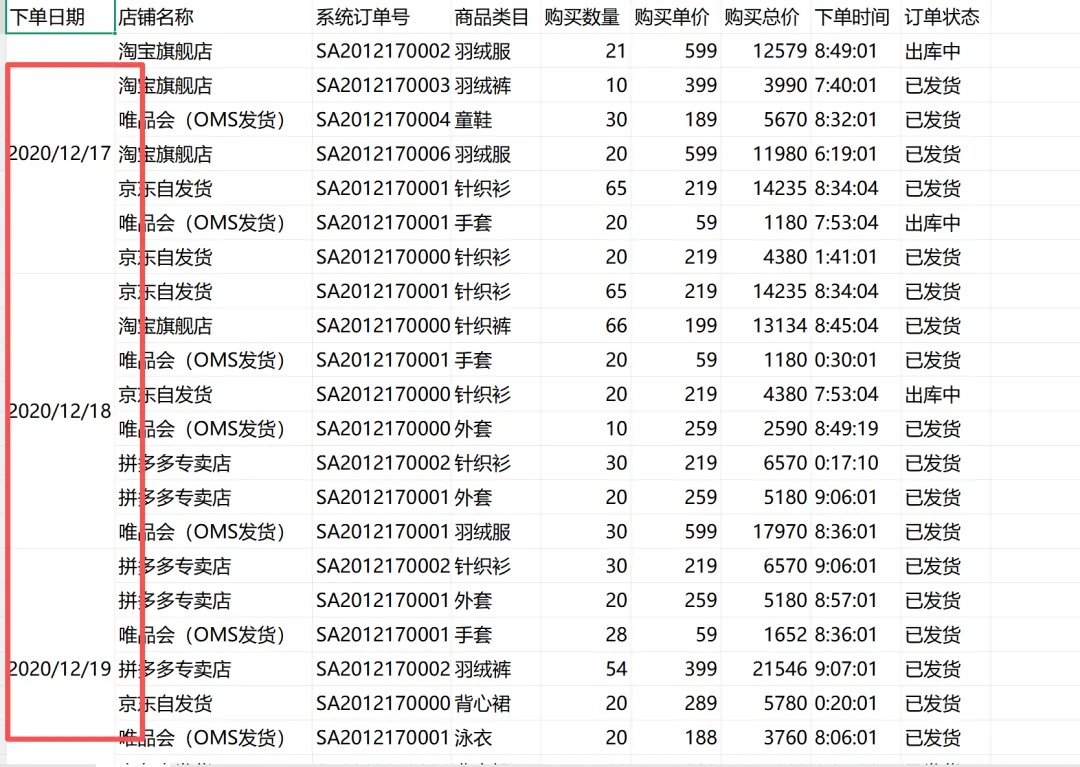 设置如下,先通过读取A列所有日期,再去重,再查找日期一样的行,并根据查找结果合并单元格。