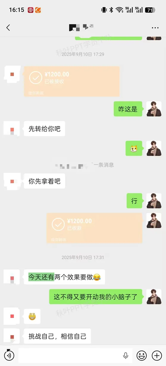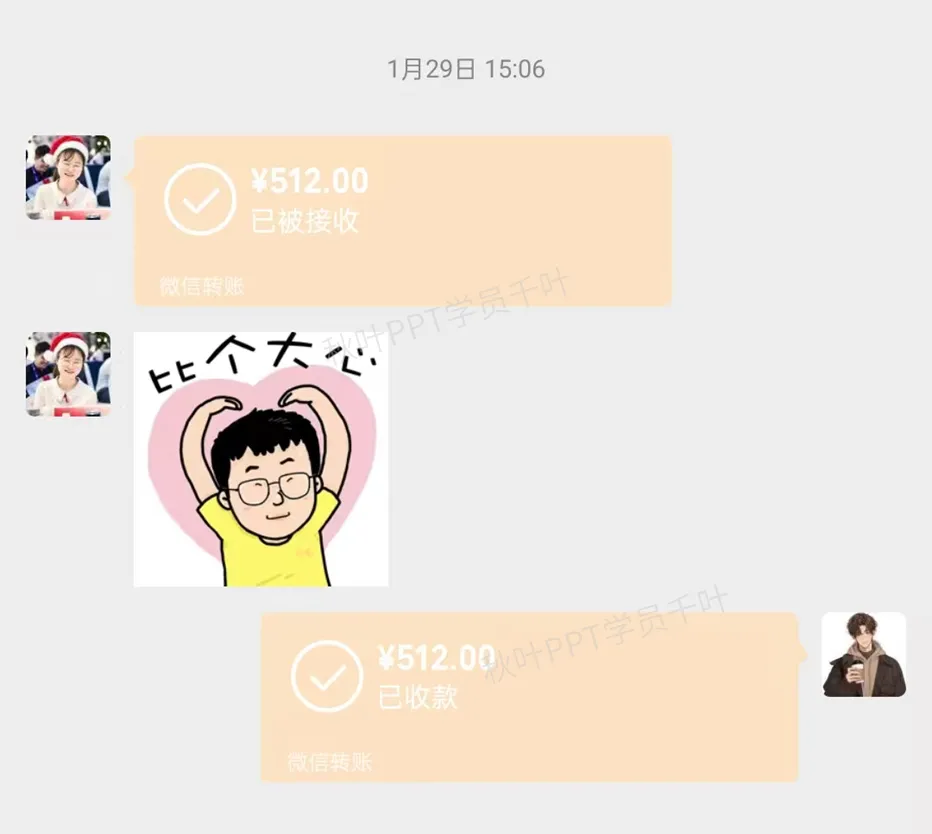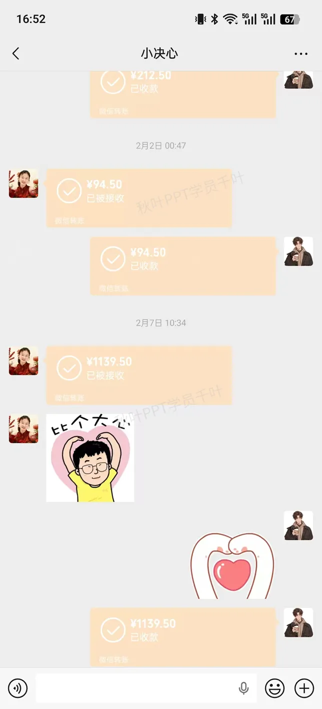 这里就不得不提到我最大的“财富来源”——负责派单的 @小决心 学姐!这些转账都是我顺利完成PPT订单的证明 ↓