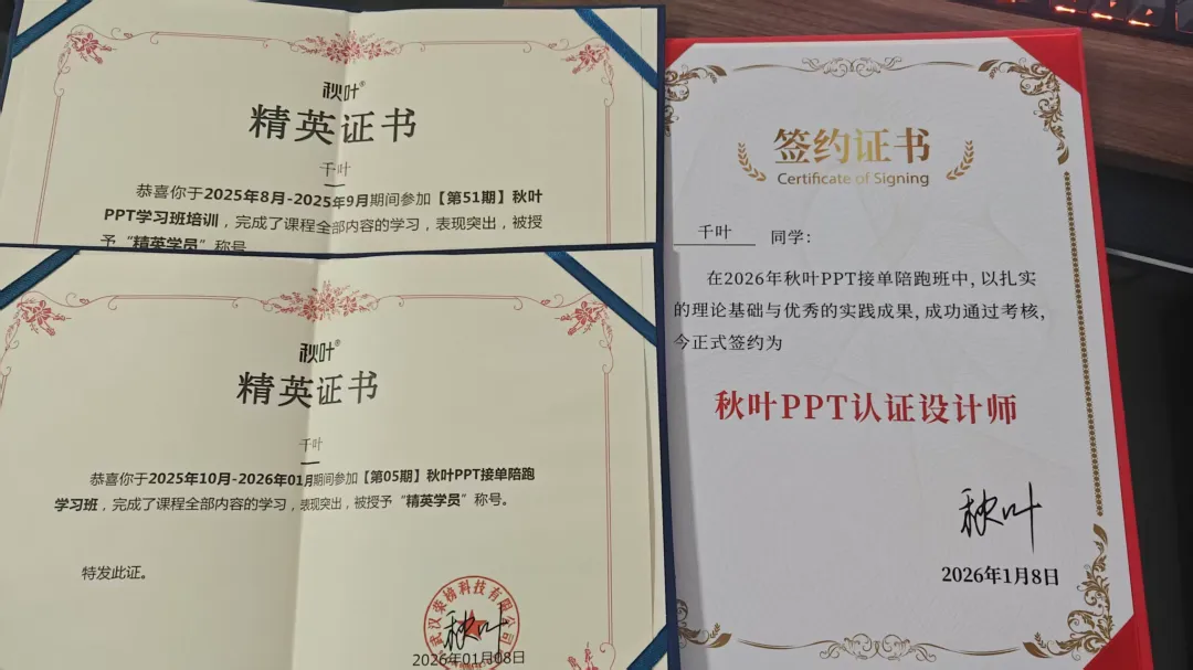 在秋叶老师、助教、辅导员、学长学姐、同学们的帮助下,我顺利毕业,还拿到了精英学员证书,并且成为秋叶PPT签约设计师!