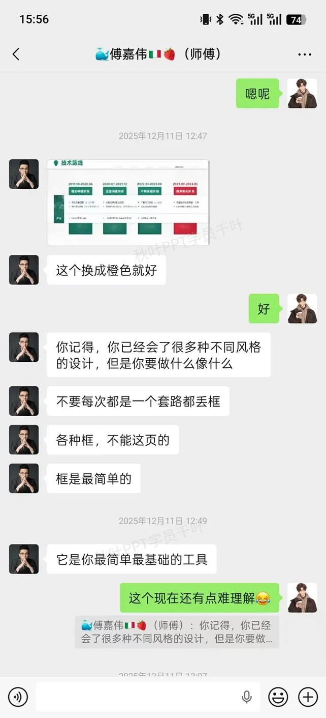 从一个打小学习没自信的PPT小白,到成为PPT定制设计师、自由职业者,再到能为其他学员解答问题、点评指导,这个过程不仅让我对PPT设计的理解更深刻,也让我重新找到了自己的价值。