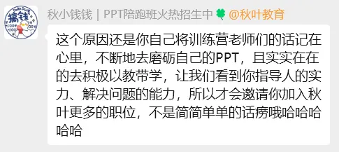 训练营提供的兼职工作,不仅能让我用“以教代学”的方式不断提升自己,还能获得一笔额外收入吃几顿好的,同时也帮助秋叶PPT的学员们学的更稳更扎实。