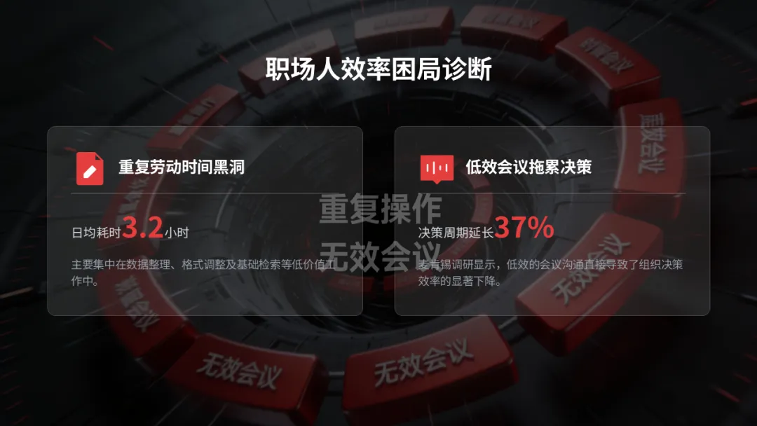 行政工作核心痛点集中在会议纪要整理、待办清单制定、日常文书撰写等重复性工作,耗时且易遗漏重点。