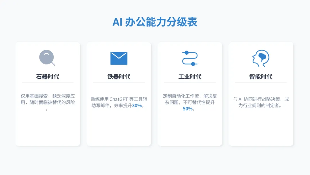 在当下的职场中,重复劳动、低效会议等效率困局成为众多职场人的共同痛点,AI 的出现则为打破困局、实现效率翻倍提供了全新可能。从建立正确的 AI 认知,到选对工具落地应用,再到规避风险实现人机高效协作,掌握 AI 办公能力,已然成为职场人的核心竞争力。本文将从岗位赋能、AI 学习、劣势识别、工具选择四大核心维度,为你拆解 AI 办公的实战技巧,助你完成从职场 “打工人” 到 AI 指挥官的进化。
