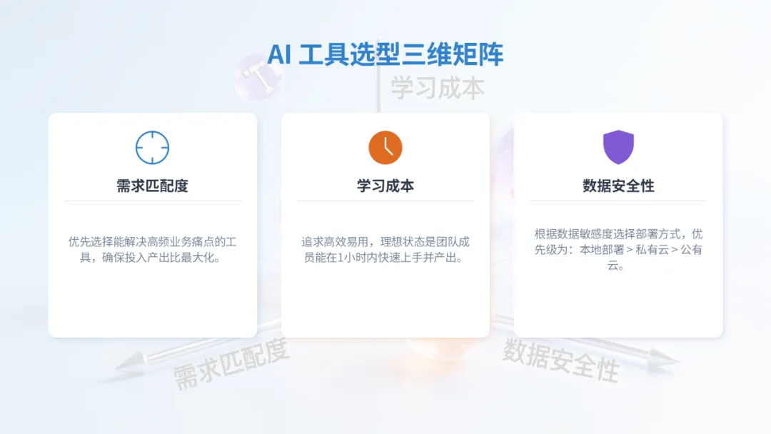 面对市面上五花八门的 AI 工具,盲目选择只会导致 “工具冗余、效率更低”,遵循需求匹配度、学习成本、数据安全性三大核心原则,才能选到真正适合自己的 AI 工具,实现投入产出比最大化。