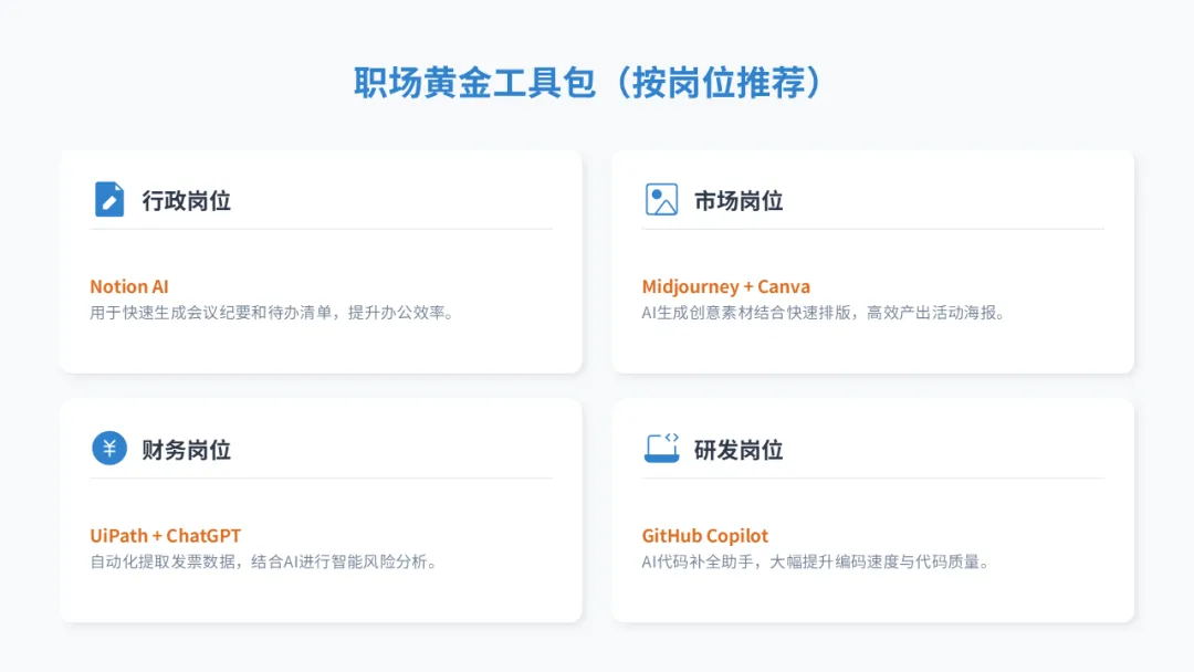具体行动:每天用 AI 完成 1 项岗位重复任务,如行政岗用 Notion AI 整理 1 份会议纪要,财务岗用 UiPath 提取 1 批发票数据;花 30 分钟学习工具基础操作,掌握核心功能的使用方法,重点练习 “指令输入” 技巧,让 AI 精准理解你的需求。