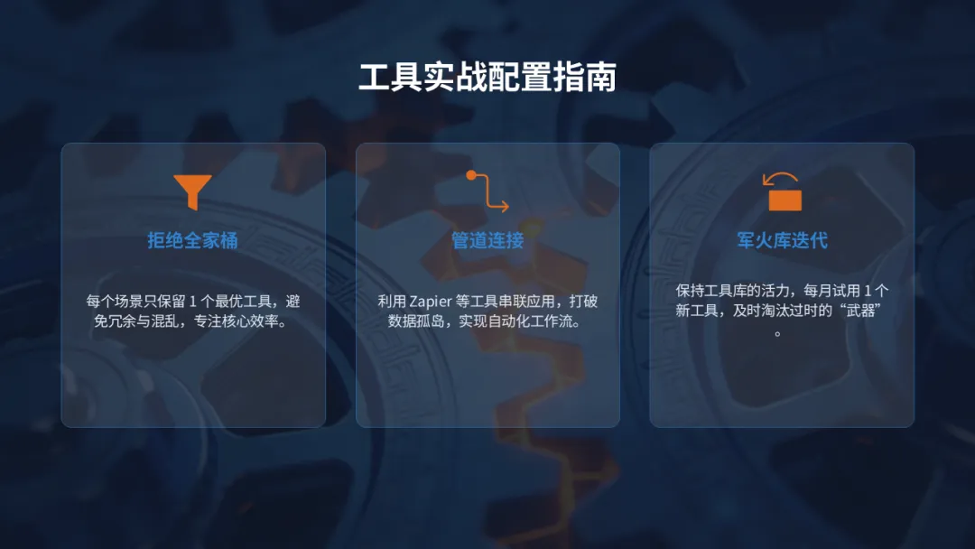 军火库迭代:保持工具库的活力,每月试用 1 个新工具,及时淘汰功能落后、不贴合当前工作需求的工具。