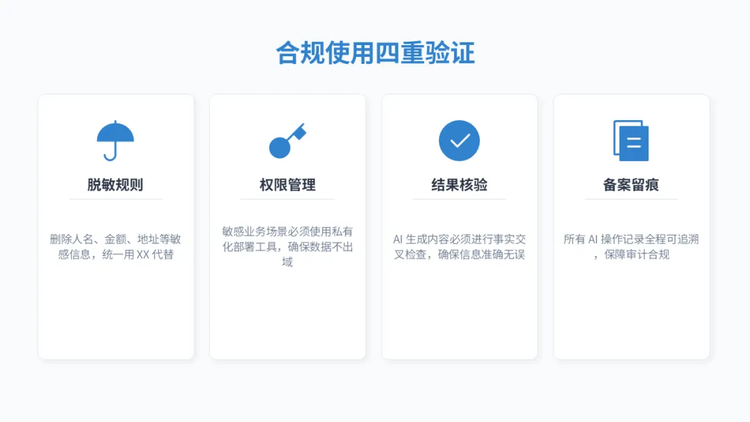 做好合规使用四重验证:对敏感信息进行脱敏处理(删除人名、金额、地址,用 XX 代替);敏感业务场景使用私有化部署工具,确保数据不出域;对 AI 生成内容进行事实交叉检查,保证信息准确;所有 AI 操作记录全程备案留痕,保障审计合规。