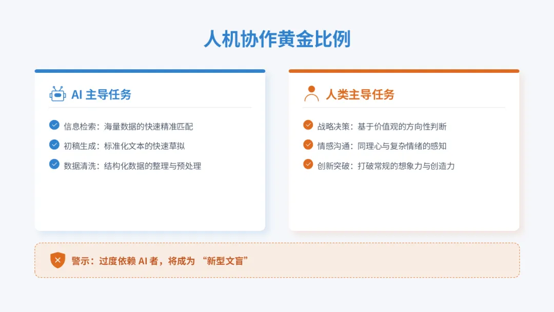 AI 是职场人的 “助手”,而非 “替代者”,掌握人机协作的黄金比例,才能让 AI 的价值最大化,同时规避潜在的使用风险。