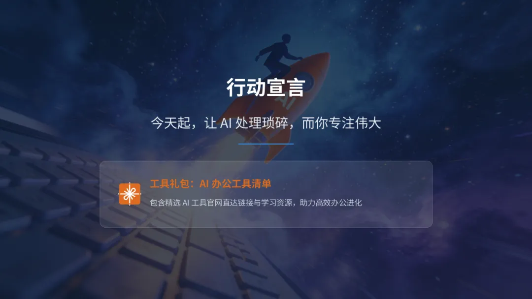 今天起,让 AI 处理琐碎,让自己专注伟大。从选对一款岗位 AI 工具开始,从完成一次 AI 辅助的工作任务开始,你终将完成从工具奴隶到 AI 指挥官的进化,在 AI 时代的职场中,占据属于自己的核心位置。