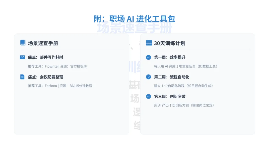 具体行动:用 AI 完成 1 项岗位综合工作任务(如撰写一份完整的行业报告、策划一场全流程的市场活动),全程运用 AI 完成数据提取、分析、文案撰写、视觉包装等环节;复盘 30 天学习成果,总结工具使用技巧、指令设计方法,梳理出适合自己的 AI 办公 “最优解”。
