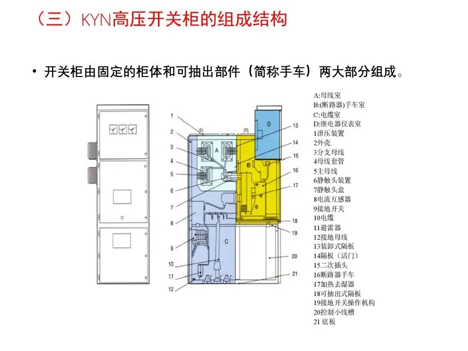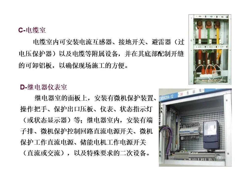 电缆室内可安装电流互感器、接地开关、避雷器(过电压保护器)以及电缆等附属设备,并在其底部配制开缝的可卸铝板,以确保现场施工的方便。