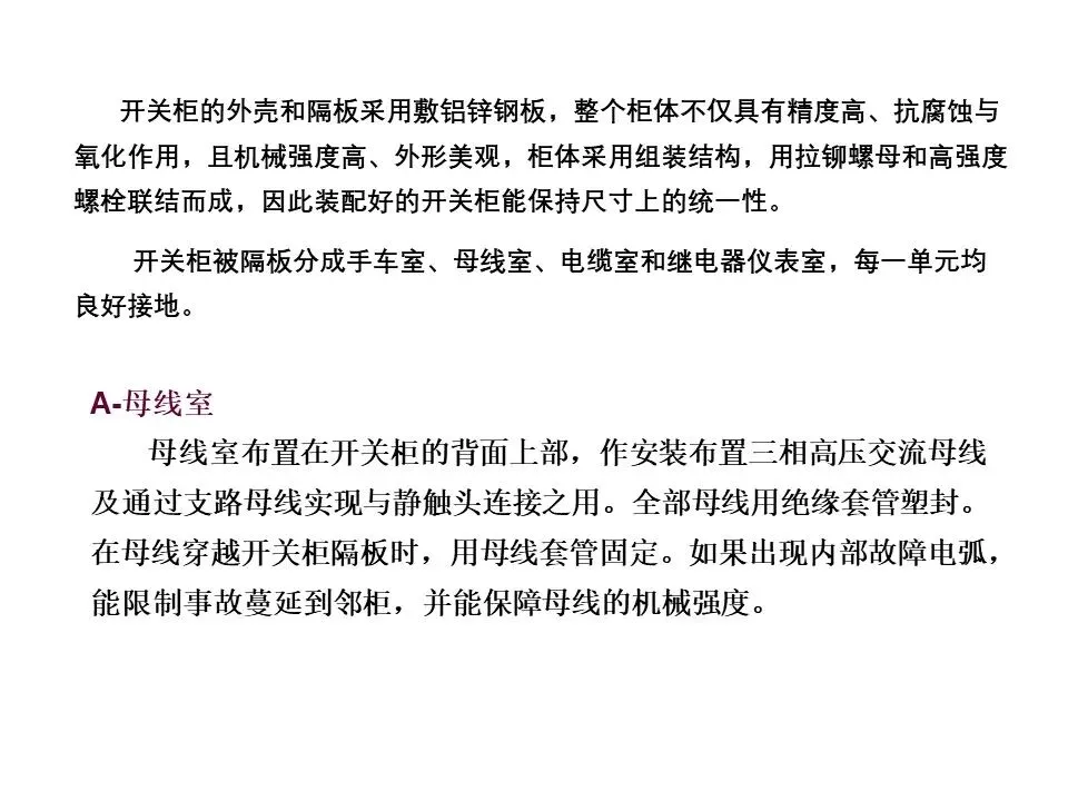 母线室布置在开关柜的背面上部,作安装布置三相高压交流母线及通过支路母线实现与静触头连接之用。全部母线用绝缘套管塑封。在母线穿越开关柜隔板时,用母线套管固定。如果出现内部故障电弧,能限制事故蔓延到邻柜,并能保障母线的机械强度。