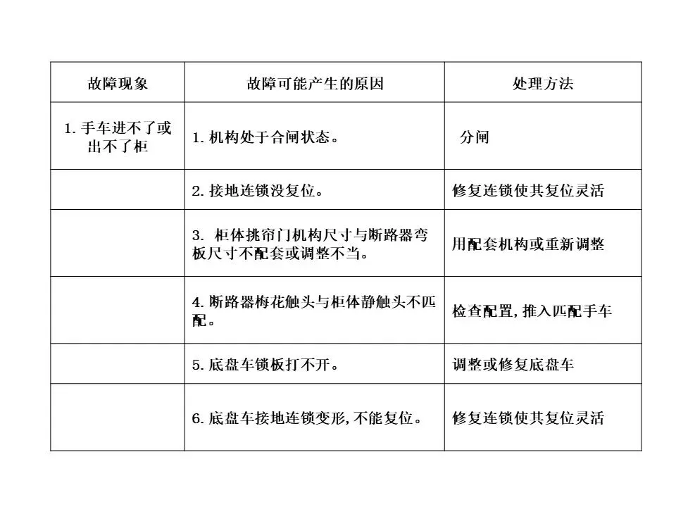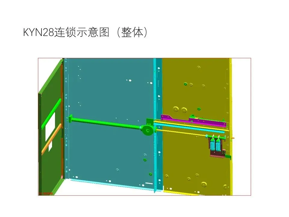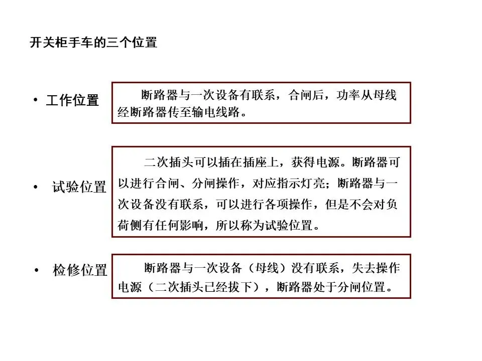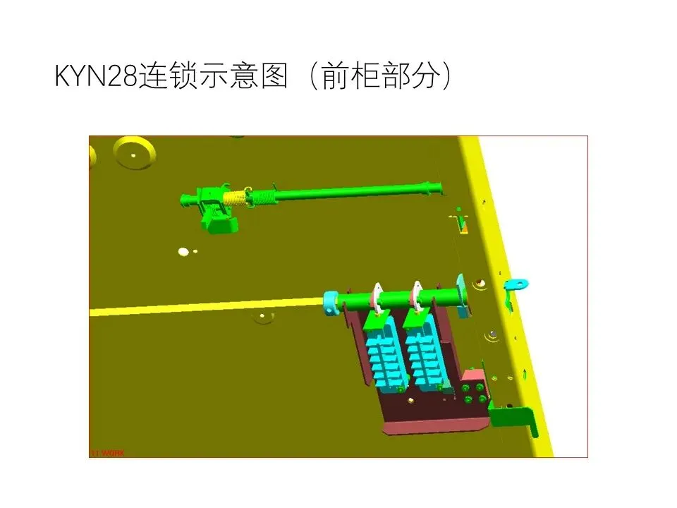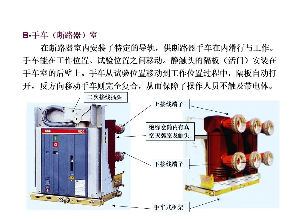 在断路器室内安装了特定的导轨,供断路器手车在内滑行与工作。手车能在工作位置、试验位置之间移动。静触头的隔板(活门)安装在手车室的后壁上。手车从试验位置移动到工作位置过程中,隔板自动打开,反方向移动手车则完全复合,从而保障了操作人员不触及带电体。