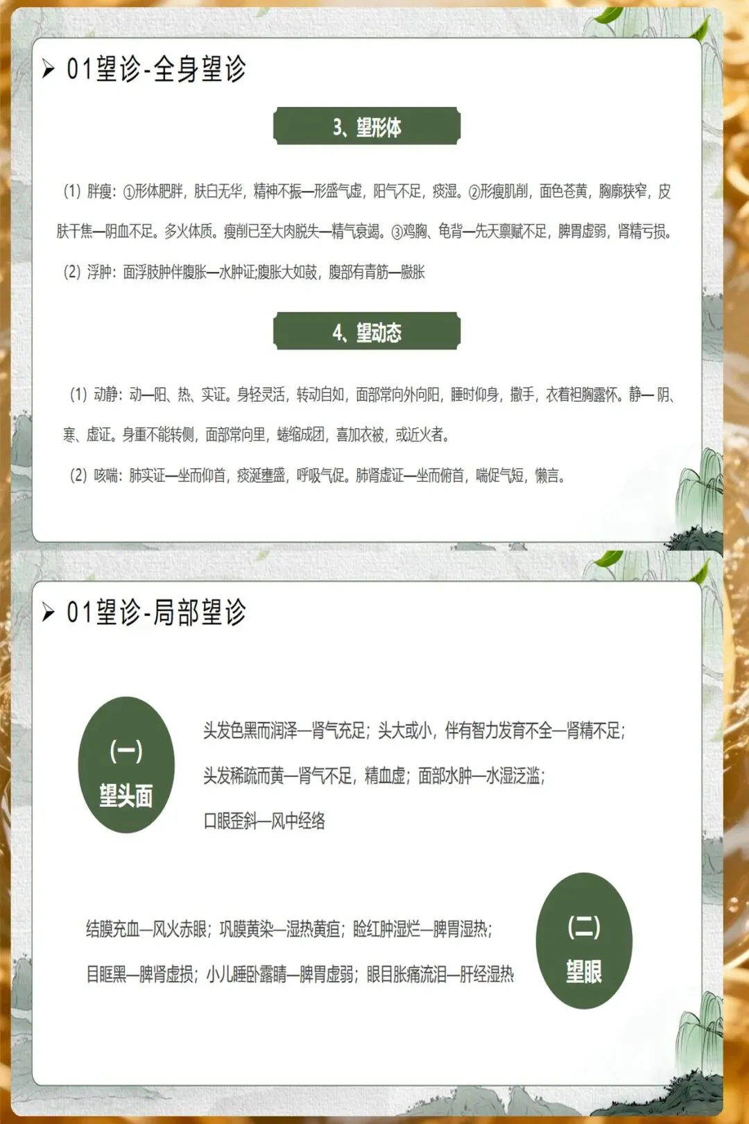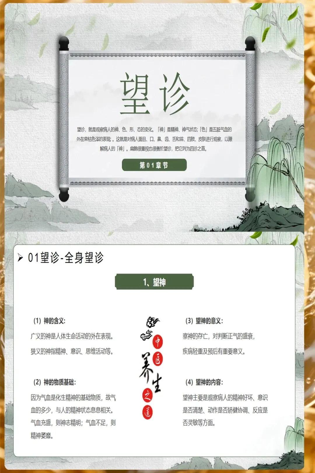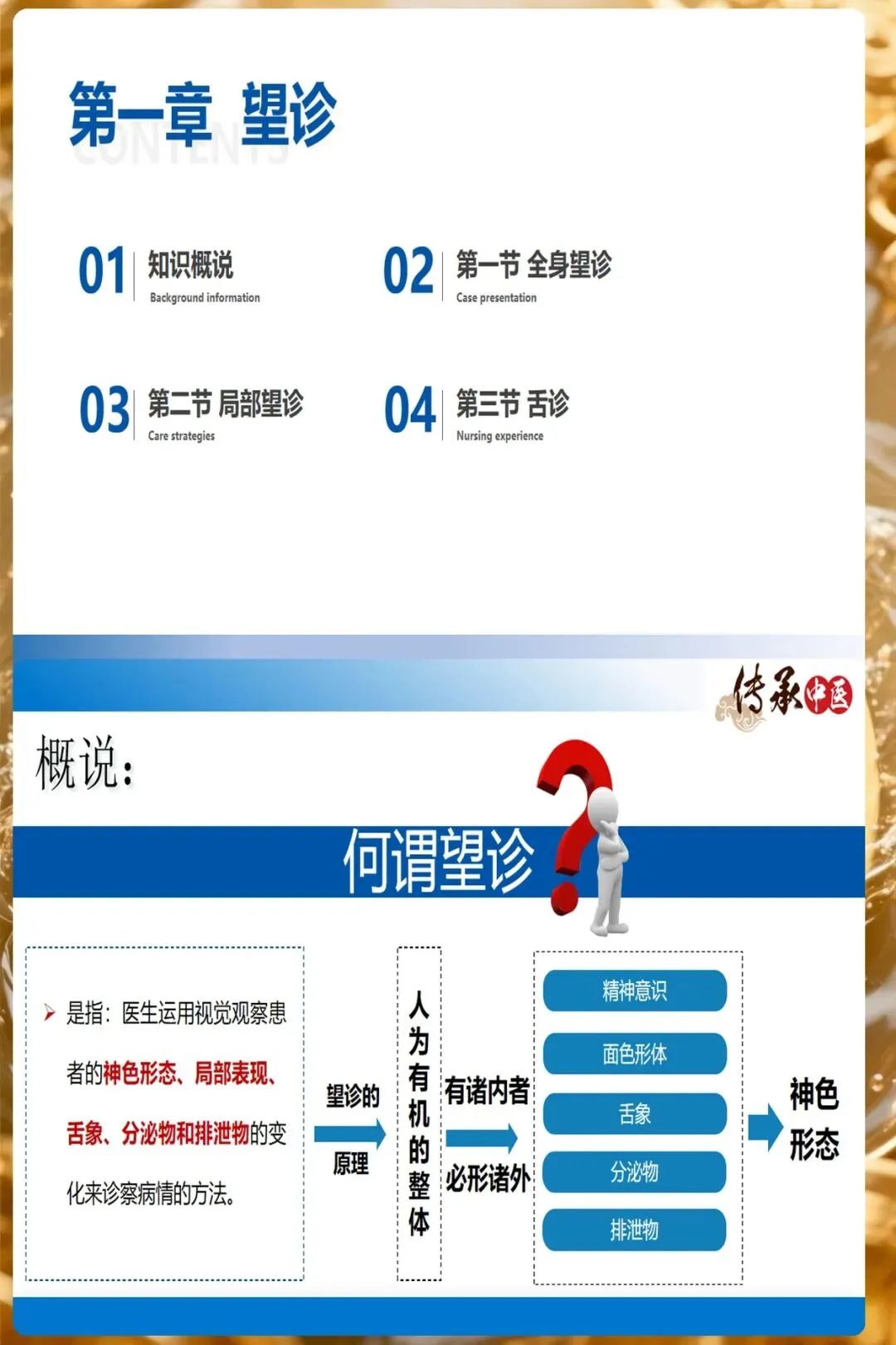 望诊是中医四诊之首,它通过观察患者的神、色、形、态、舌象等方面的变化,来判断患者的病情。望诊的内容包括望神、望色、望形、望态、望舌等。望神主要是观察患者的精神状态、意识状态和面部表情等,以判断患者的正气盛衰和病情轻重。望色主要是观察患者的面色、肤色等,以判断患者的气血盛衰和病情寒热虚实。望形主要是观察患者的体型、体态等,以判断患者的体质和病情。望态主要是观察患者的动作、姿态等,以判断患者的病情和肢体功能。望舌是望诊的重要内容之一,它通过观察患者的舌质、舌苔等方面的变化,来判断患者的病情和脏腑功能。舌质主要反映人体的气血盛衰和脏腑功能,舌苔主要反映人体的寒热虚实和邪气盛衰。