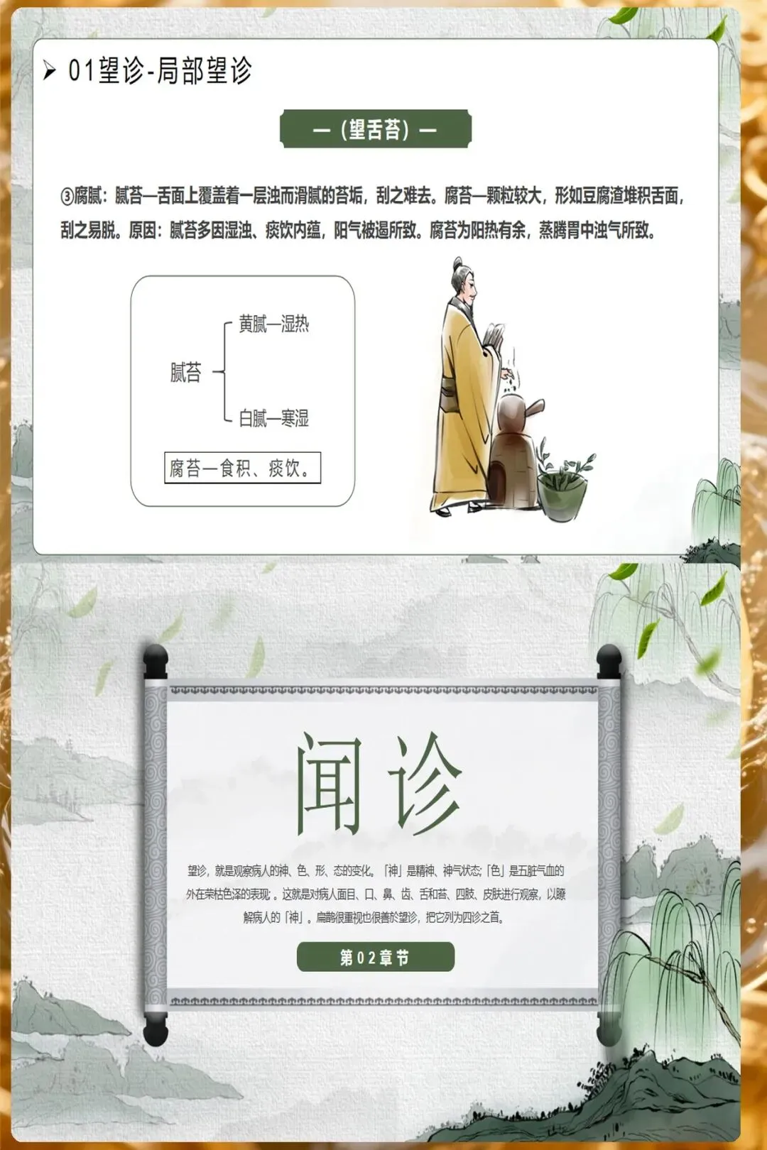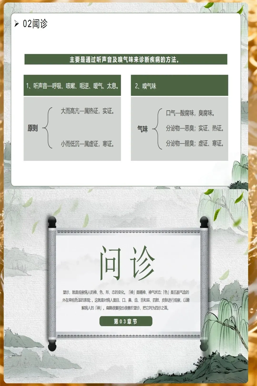 闻诊是通过倾听患者的声音和气味,来判断患者的病情。闻诊的内容包括听声音和嗅气味两个方面。听声音主要是听患者的语声、呼吸声、咳嗽声、呕吐声等,以判断患者的病情和脏腑功能。例如,语声低微可能是正气不足的表现,语声高亢可能是热证的表现;呼吸急促可能是肺热的表现,呼吸微弱可能是肺虚的表现;咳嗽声重浊可能是风寒咳嗽的表现,咳嗽声清脆可能是风热咳嗽的表现。嗅气味主要是嗅患者的口气、汗味、痰味、二便气味等,以判断患者的病情和脏腑功能。例如,口气臭秽可能是胃火炽盛的表现,口气酸腐可能是食积的表现;汗味腥膻可能是湿热内蕴的表现,汗味淡而无味可能是气虚的表现。