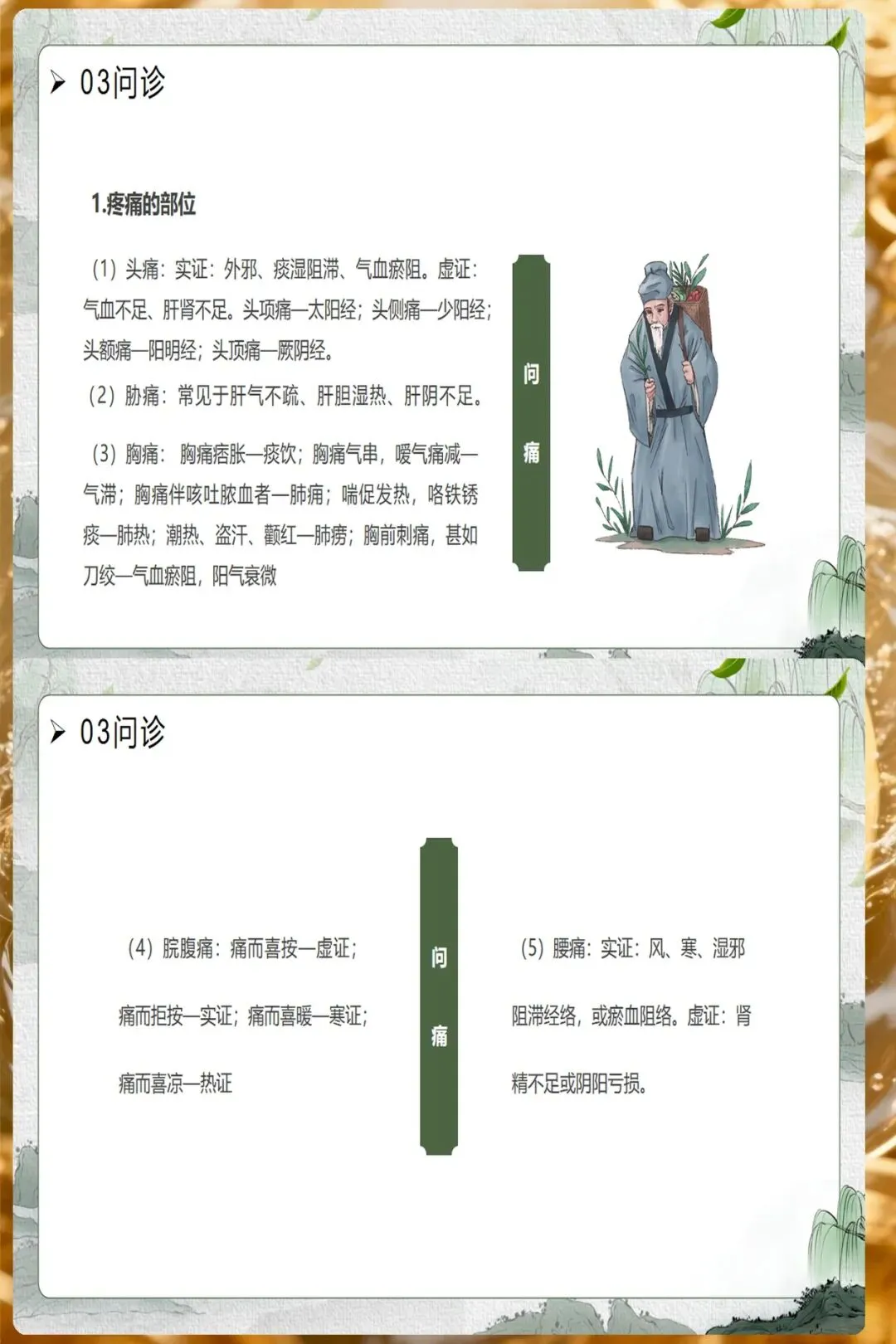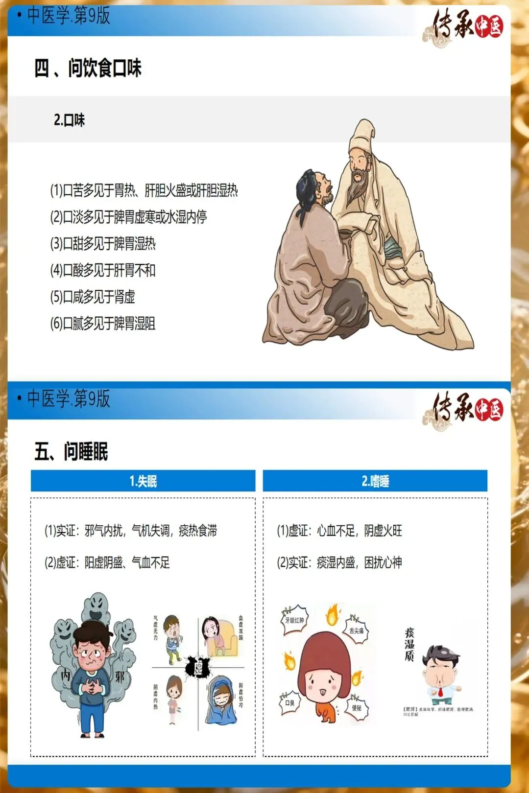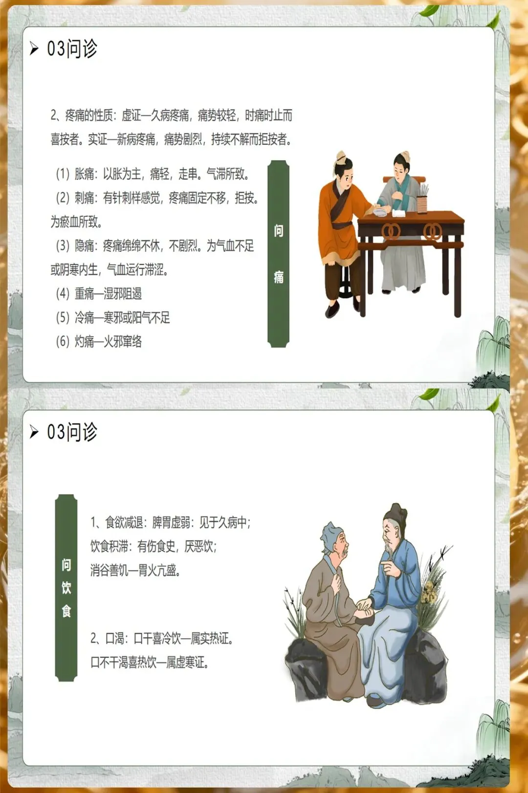 问诊是通过询问患者的症状、病史、生活习惯等方面的情况,来全面了解患者的病情。问诊是中医四诊中最直接、最全面的诊断方法,它可以帮助医生了解患者的病情发展过程、症状特点、既往病史、家族病史等方面的情况,为诊断和治疗提供重要的依据。问诊的内容包括一般情况、主诉、现病史、既往史、个人史、家族史等方面。一般情况主要包括患者的姓名、性别、年龄、职业、婚姻状况等;主诉是患者最主要的症状和体征,以及持续的时间;现病史是患者本次发病的情况,包括发病时间、发病原因、症状特点、病情发展过程、治疗经过等;既往史是患者过去的健康状况和疾病史;个人史是患者的生活习惯、饮食习惯、工作环境等方面的情况;家族史是患者家族中是否有遗传性疾病或传染性疾病等方面的情况。