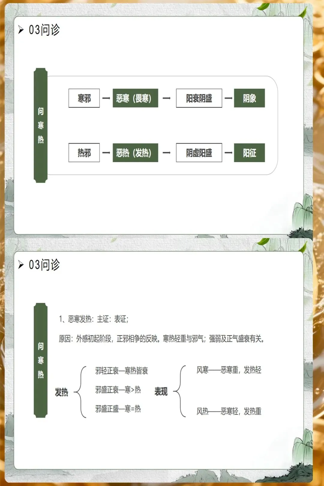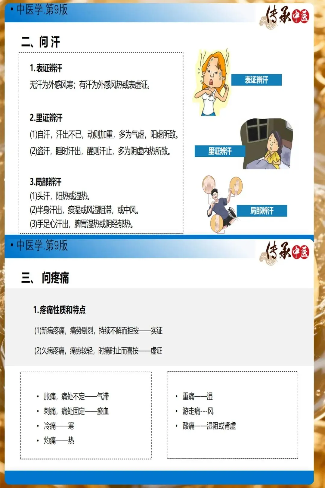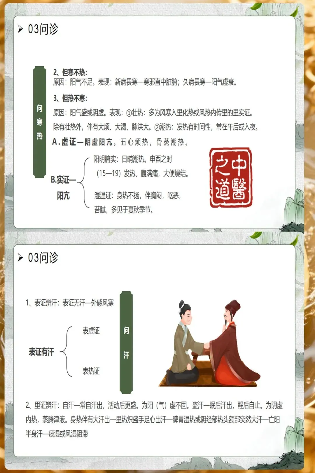 问诊是通过询问患者的症状、病史、生活习惯等方面的情况,来全面了解患者的病情。问诊是中医四诊中最直接、最全面的诊断方法,它可以帮助医生了解患者的病情发展过程、症状特点、既往病史、家族病史等方面的情况,为诊断和治疗提供重要的依据。问诊的内容包括一般情况、主诉、现病史、既往史、个人史、家族史等方面。一般情况主要包括患者的姓名、性别、年龄、职业、婚姻状况等;主诉是患者最主要的症状和体征,以及持续的时间;现病史是患者本次发病的情况,包括发病时间、发病原因、症状特点、病情发展过程、治疗经过等;既往史是患者过去的健康状况和疾病史;个人史是患者的生活习惯、饮食习惯、工作环境等方面的情况;家族史是患者家族中是否有遗传性疾病或传染性疾病等方面的情况。