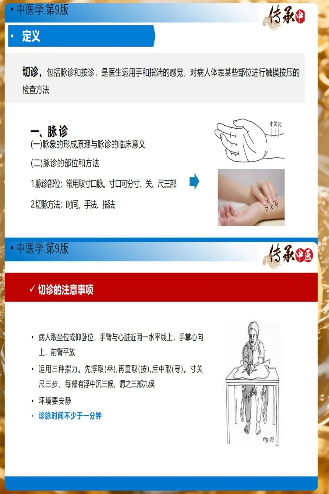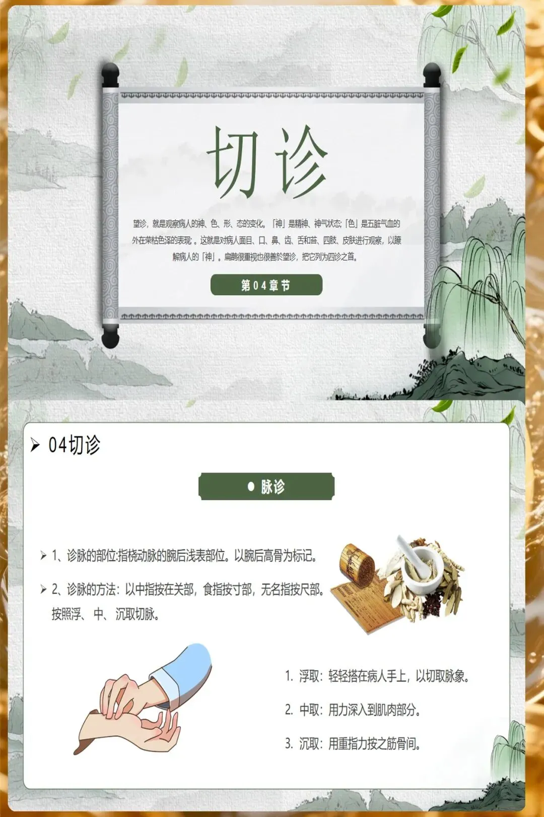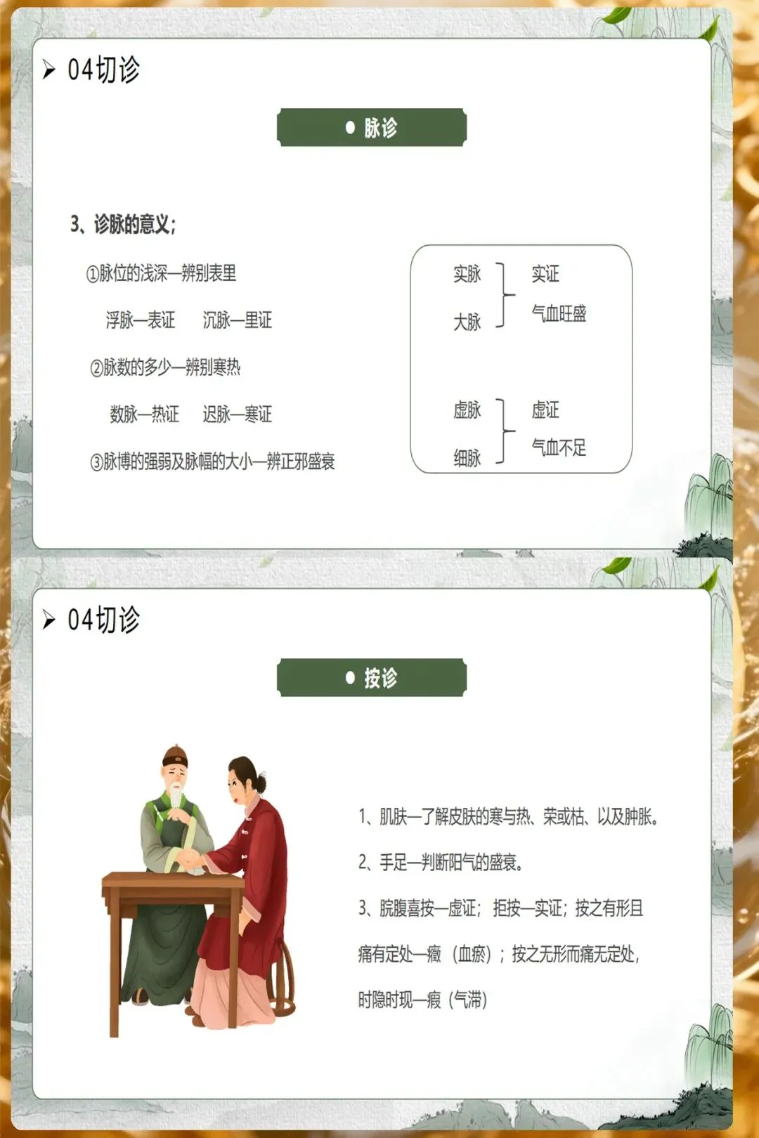 切诊是通过触摸患者的脉象和身体,来判断患者的病情。切诊的内容包括脉诊和按诊两个方面。脉诊是切诊的核心内容,它通过触摸患者的桡动脉,来感受脉象的变化,以判断患者的病情和脏腑功能。脉象是中医诊断疾病的重要依据之一,它反映了人体气血的盛衰、脏腑功能的强弱、邪气的盛衰等方面的情况。脉象的种类繁多,常见的脉象有浮脉、沉脉、迟脉、数脉、虚脉、实脉、滑脉、涩脉等。不同的脉象反映了不同的病情和脏腑功能,例如,浮脉通常表示表证,沉脉通常表示里证,迟脉通常表示寒证,数脉通常表示热证,虚脉通常表示虚证,实脉通常表示实证,滑脉通常表示痰饮、食积或妊娠,涩脉通常表示气滞、血瘀或精血不足。