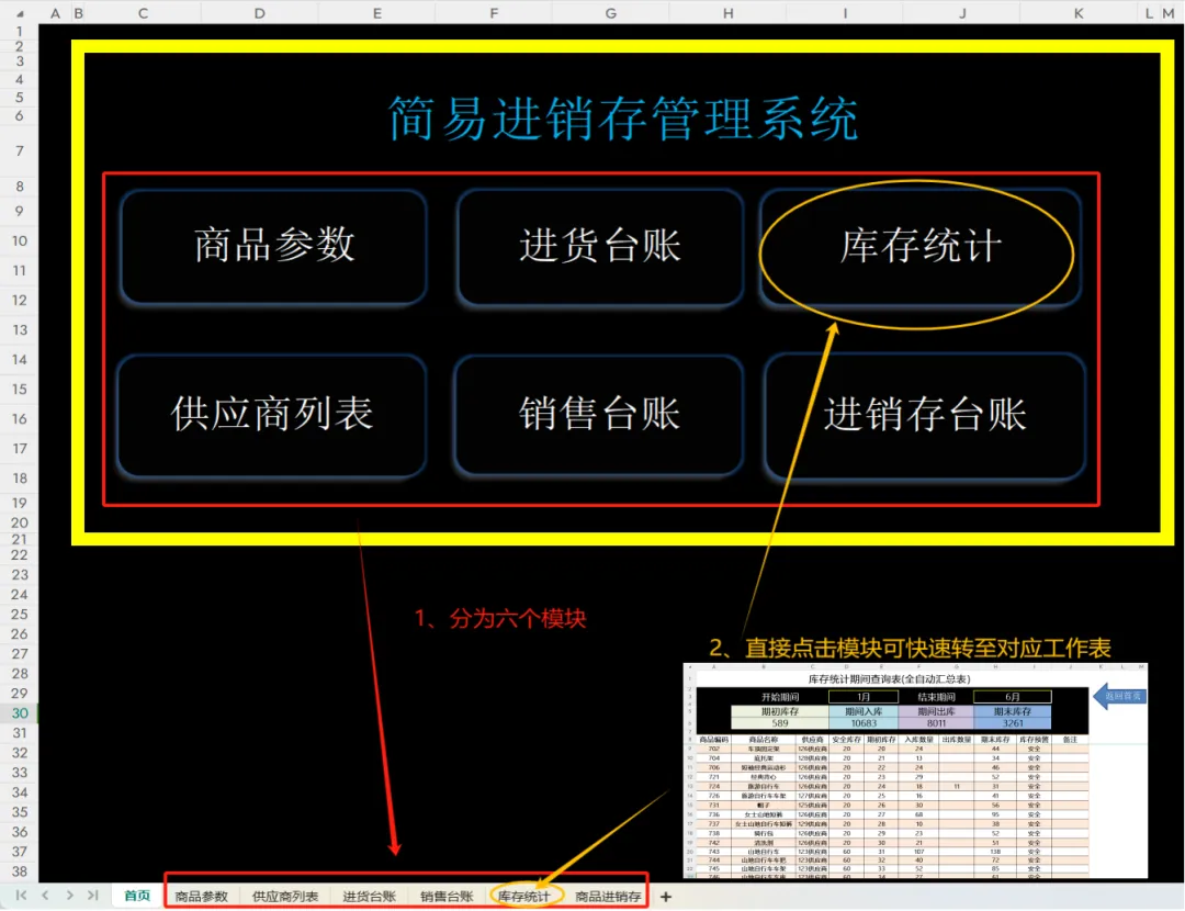 大家好!今天给大家介绍一款用Excel搭建的简易存货进销存管理用表,它能够帮助您高效地管理库存、进货和销售等业务。本系统主要分为六个模块,分别是商品参数、供应商列表、进货台账、销售台账、库存统计和商品进销存,您可以直接点击模块名称快速转至对应工作表。